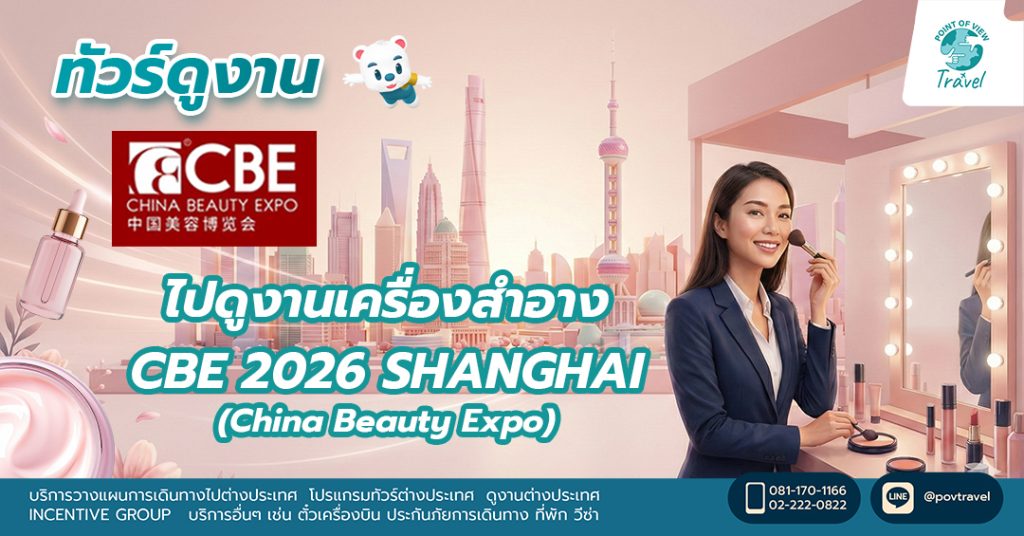 ไปดูงานเครื่องสำอาง CBE 2026 SHANGHAI สนใจสอบถามรายละเอียดจัดไปแบบทัวร์ไปส่วนตัวแบบ 10 ท่านขึ้นไป หรือ ให้ทางเราดูแล เป็นแบบ package 4 ท่าน เดินทางเองทำราคาแบบรวมตั๋ว , ไกด์ , ทำวีซ่า , ที่พัก , บัตรเข้างาน , รถรับ – ส่ง หรือจัดตามงบประมาณสอบถามก่อนได้ คลิกไลน์แอดที่นี่ โทร 081-170-1166 หรือ เมล์ INFO@POVTRAVEL.CO.TH เข้าเว็บ Point of View Travel